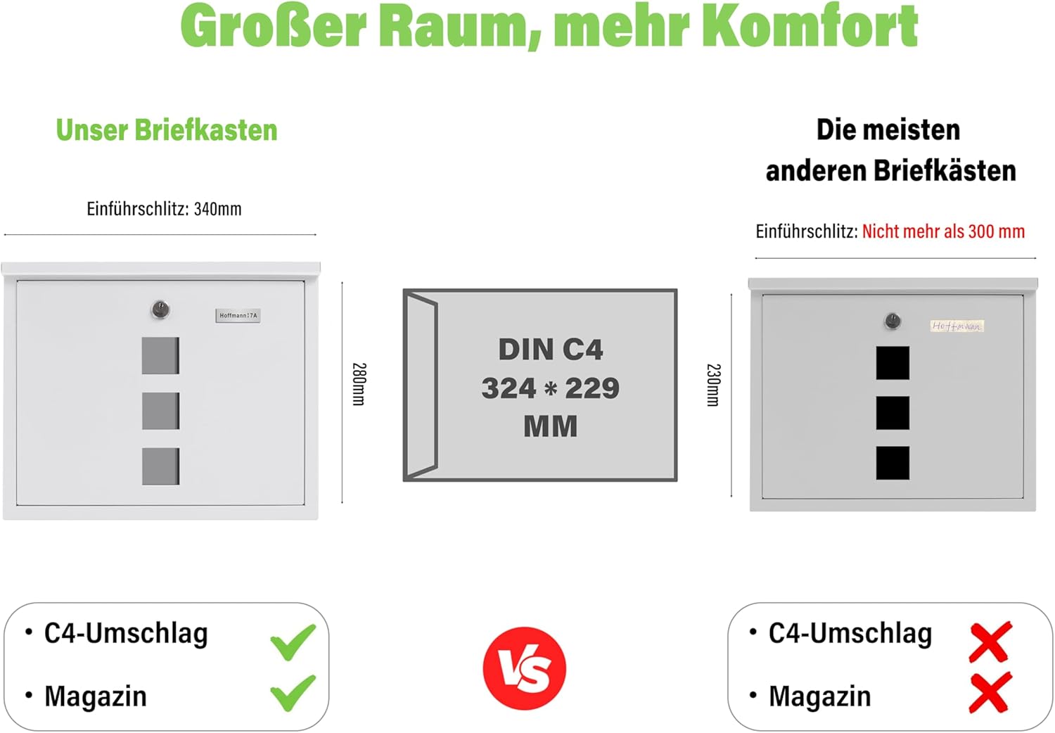 - 【Large Size Design】Maße des Briefkastens: 9.5 x 35 x 28 cm, Briefschlitz: 3,0 x 33 cm. Bietet Platz für Briefumschläge bis C4 und erleichtert den Zugang zu Briefen. Briefe können jederzeit ordnungsgemäß empfangen und aufbewahrt werden, ohne dass ein Brief verloren geht.
