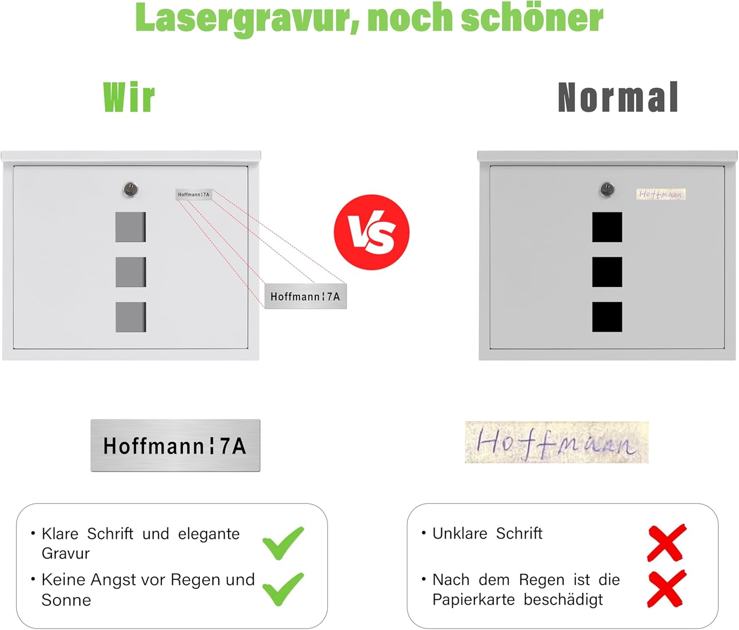 - 【Mit/ohne Namensschild】Sie können wählen, ob Sie das Namensschild personalisieren möchten oder nicht.Wir bieten Ihnen professionelle Namensschilder aus Edelstahl mit einer speziellen Lasergravur Ihres Namens und Ihrer Hausnummer. Die Gravur ist deutlich sichtbar und auch aus größerer Entfernung lesbar. Personalisierte Namensschilder sind nicht nur ästhetisch ansprechend, sondern erhöhen auch den Wiedererkennungswert Ihres Briefkastens, so dass Postboten und Besucher schnell den richtigen Bewohner finden. Sie können Ihre bevorzugte Schriftart auswählen und die gewünschten Daten eingeben, indem Sie auf den Button „Jetzt personalisieren“ klicken.