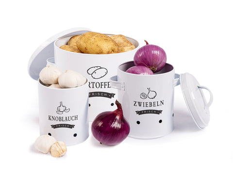 - GENUG PLATZ : Drei Arten von Behältern können alle Arten von Lebensmitteln aufbewahren.Kartoffeltopf (D.23cm * H.23cm) kann bis zu 4 kg Kartoffeln aufnehmen,Zwiebeltopf (D.14cm * H.19cm) kann 1,5 kg Zwiebeln aufnehmen,Knoblauchtopf (D.11cm * H15cm) fasst 12 Knollen.